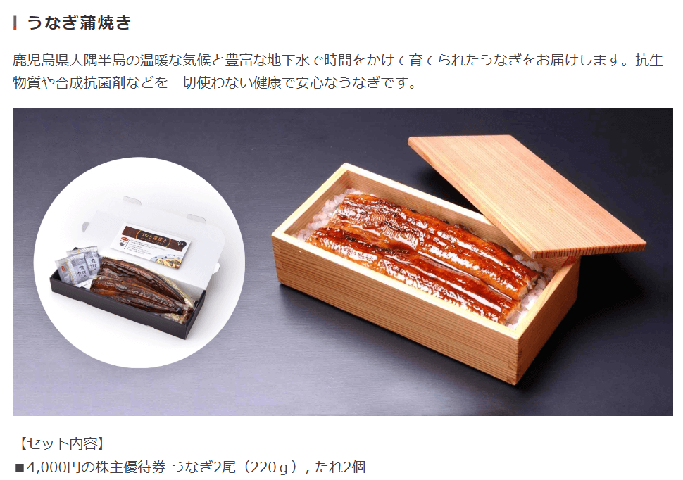 株主優待は、100株(27万円)で、自社商品券4,000円分になります。