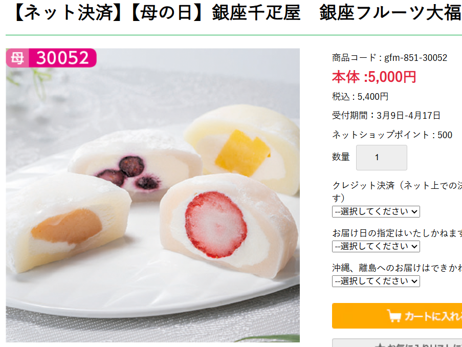 義理の母には、銀座千疋屋のフルーツ大福を注文しました。