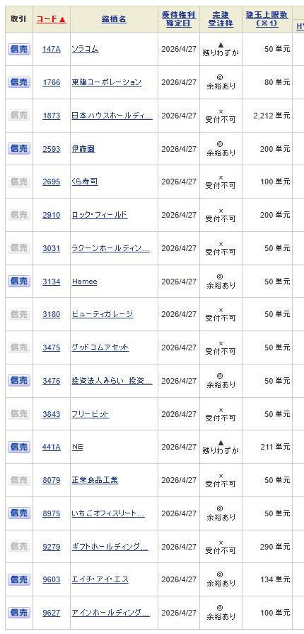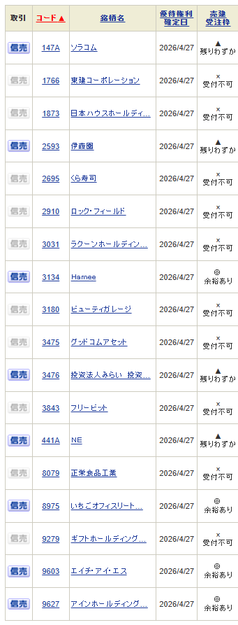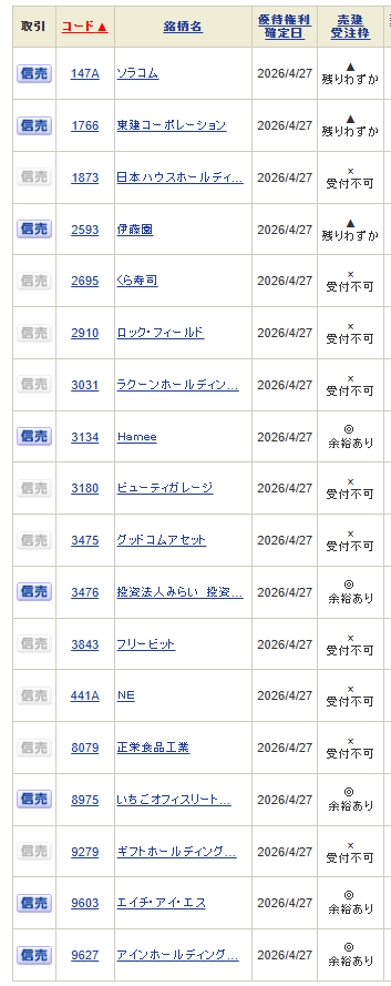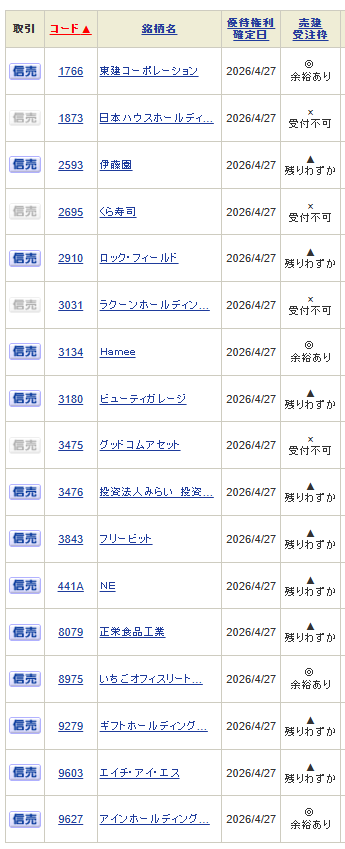 ・4月27日(月)月末銘柄 権利付き最終日