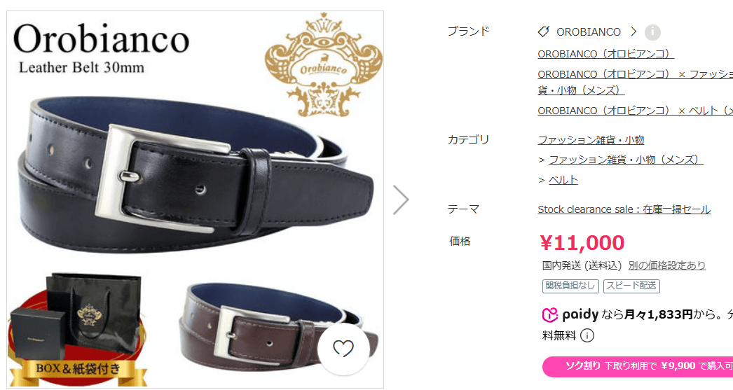 私が購入した紳士用のベルトは、楽天とかと同一値段ではありましたがポイントとか決済システム利用料を考えると割高です。