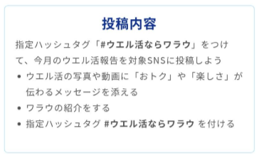 ワラウでは、ウエル活の内容をSNSに投稿するだけで、毎月50円分のポイントが無料でもらえます。