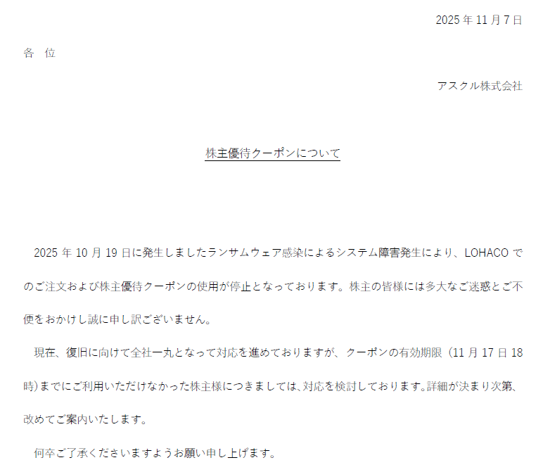 アスクルの現在の状況を考えると、期限までに復旧して株主優待が使えるということは難しそうですよね。