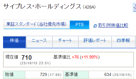 サイプレスの株価は、10月15日時点で634円でした。