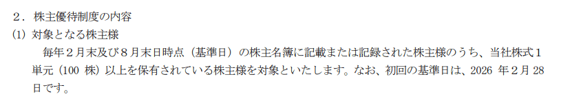 株主優待の開始は、2026年2月末からになります。