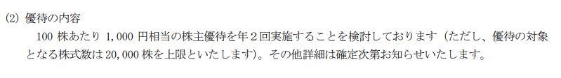 今後、株主優待の詳細が発表されるとのことでしたので、発表されましたら改めて追記していきます。