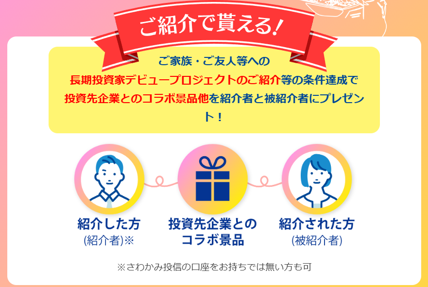 これはおまけ程度ですが、今回の長期投資家デビュープロジェクトに紹介経由で申し込むと、後日投資先企業とのコラボ景品が抽選でもらえます。