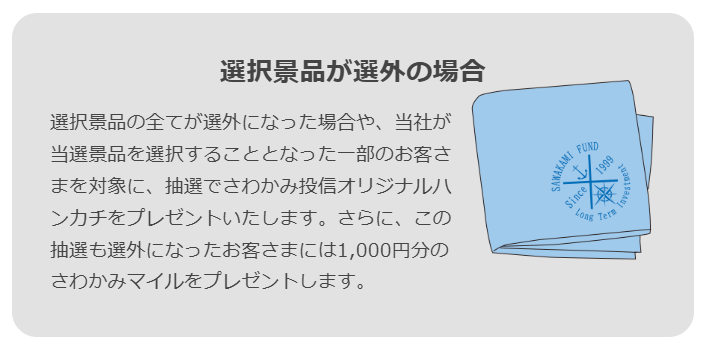 上記の抽選にハズレたとしても、さわかみ投信オリジナルハンカチか、1,000円分のさわかみマイルを貰うことができます。