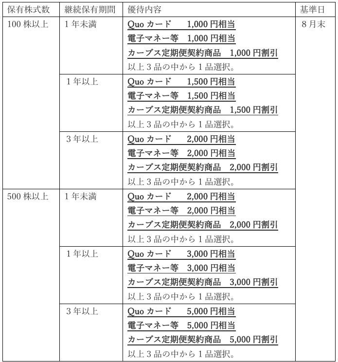カーブスの変更前の株主優待は、100株でQUOカード500円分が貰えるという内容でした。