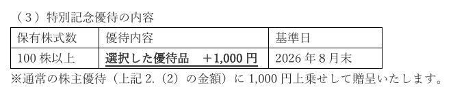 2026年8月末だけの記念優待になりますが、太っ腹な内容ですね!