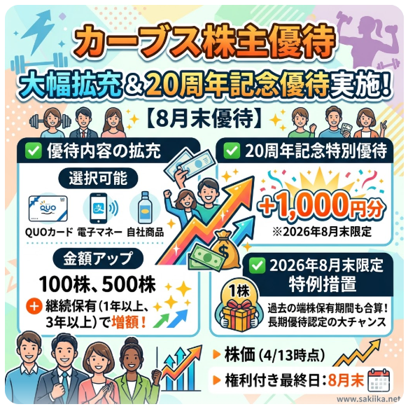 8月末優待のカーブスが、優待拡充と記念優待の実施を発表しました。