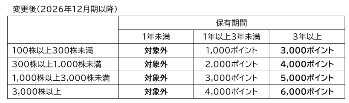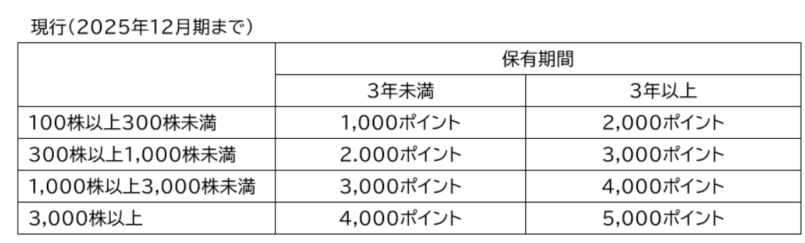 3年以上継続保有した場合、株主優待ポイントが「2,000ポイント → 3,000ポイント」に増額されます。