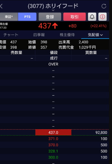 それが、優待の導入が発表されて、PTSでは437円のストップ高となっています。