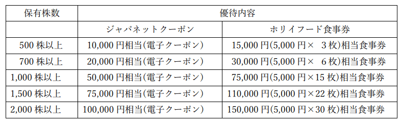 株主優待は、ジャパネットのクーポンか、ホリイフードの食事券から選ぶことが出来ます。