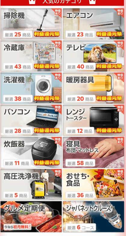 ジャパネットたかたで販売されている商品を見ましたが、家電や食品が揃っています。
