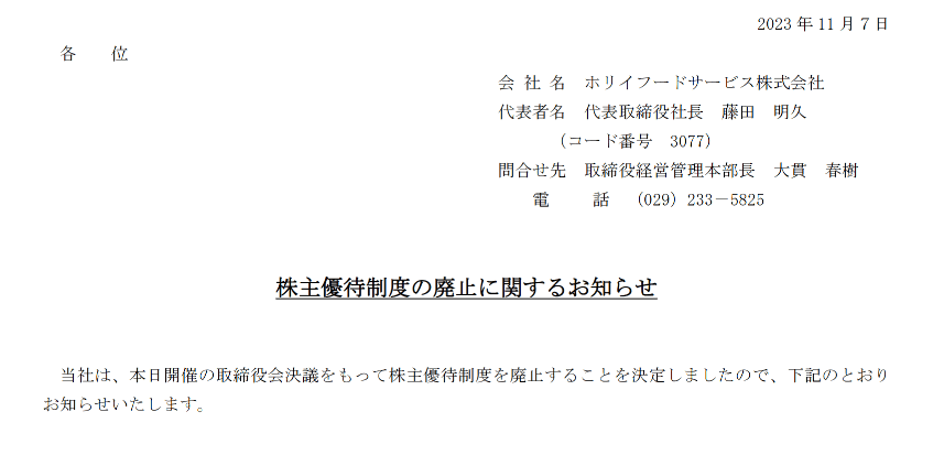 また、ホリイフードは過去に業績悪化で株主優待を廃止した経緯があります。